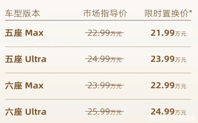 传祺向往S9乾崑共推出四款配置,Max 5座版指导价22.99万元、Max6座版指导价23.99万元、Ultra 5座版指导价24.99万元、Ultra6座版指导价25.99万元。值得一提的是,所有版本在核心配置上保持一致,全系标配华为乾崑智驾ADS 4 Max超阶版、44.5kWh宁德时代电池和广汽超级智电四驱系统。主要差异在于座椅布局和部分舒适性配置上。